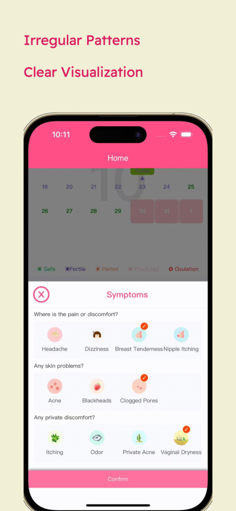 2024.10.08 2.3.56 数字版本号:366 1.修复经期跨月无法设置结束时间 2.修复无法设置月经周期和天数问题 3.修复了一些其他的已知bug